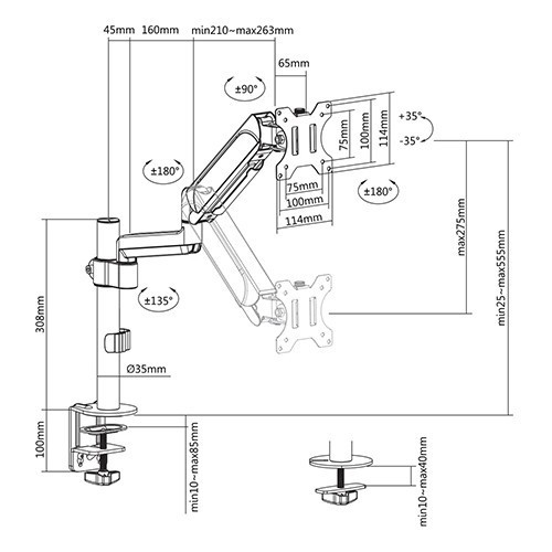 الحامل مزود بذراع غازي داخلي يوفر تعديل سلس وسريع لارتفاع الشاشة وميلانها ودورانها، مما يساعد على تقليل إجهاد الرقبة والعين. تصميمه المثبت على عمود قوي يجعل من السهل رفع الشاشة من سطح المكتب وتوفير مساحة أكبر.