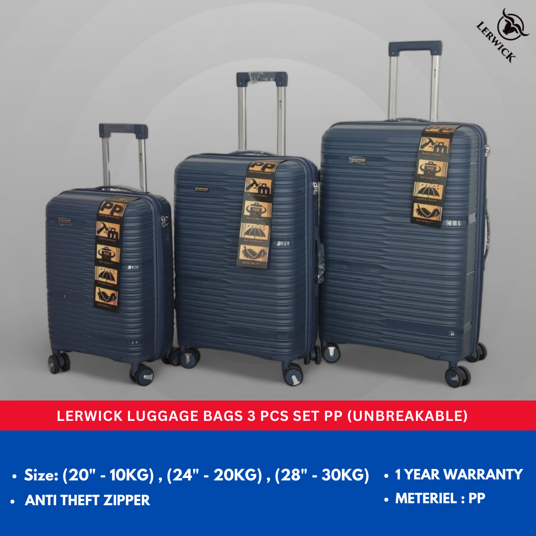 NB: LERWICK LUGGAGE TROLLY BAGS 3 PIECES SET 4 WHEEL UNBREAKBLE PP