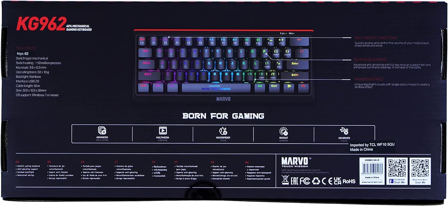 NB: MARVO Scorpion KG962-UK USB Mechanical gaming Keyboard with Red Mechanical Switches, 60% Compact Design with detachable USB Type